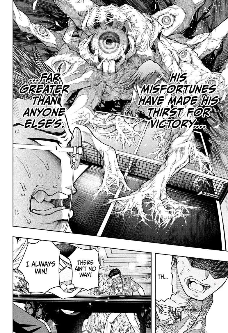По уши в долгах, старшеклассник Тайра видит единственный путь к спасению в мире подпольного пинг-понга! "Дайте мне ровный стол, мяч и ракетку, и я покажу вам настоящий пинг-понг!" Сверкающий стол и раскалённый мяч. Никто не останется в здравом уме, когда начнётся эта безумная битва за пинг-понг!