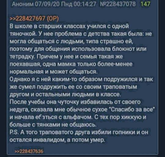 Она к слову уже поженились и живет счастливую жизнь с кучей друзяшек и путешествиями Вот вам и хикка-тян из дурки, все они на одном конвеере делаются, стоит только слегка влезть в прошивку и будет все та же сельдь, которая и на измену пойдет, и нахуй тебя пошлет, и пол имущества отожмет