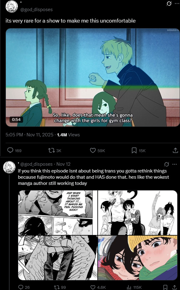 Возможно фудзи и левачок, но его работы и даже трансов там я не считаю левыми. Монстры из твитора оторые не могут создать что-то своего просто пытаются всё к себе привязать, найти воук там где его нет и сказать охуеть наши слоны сняли крутое аниме про трансов На деле японцы стали даже хуже относится к геям и тд когда слово воук стало популярно у них, а до этого им было нормально