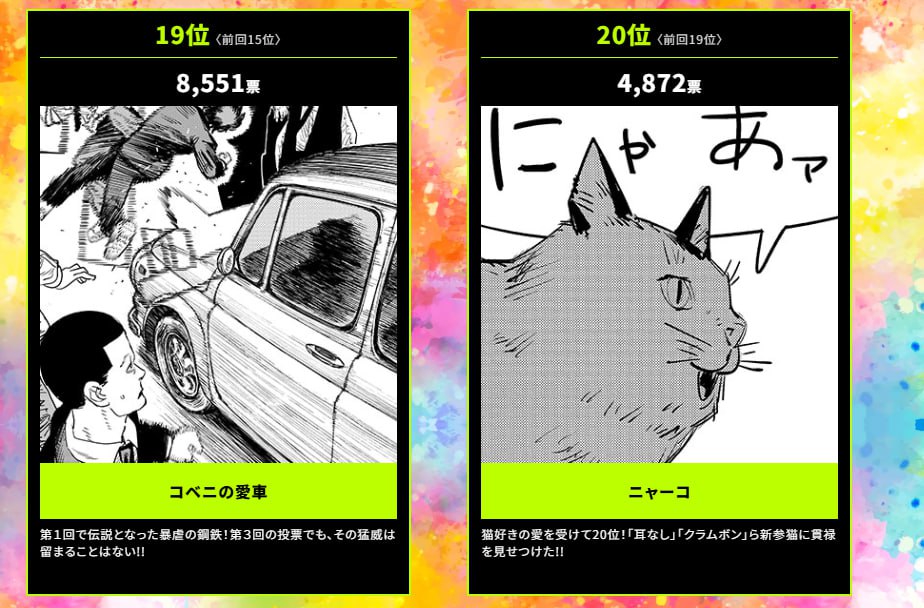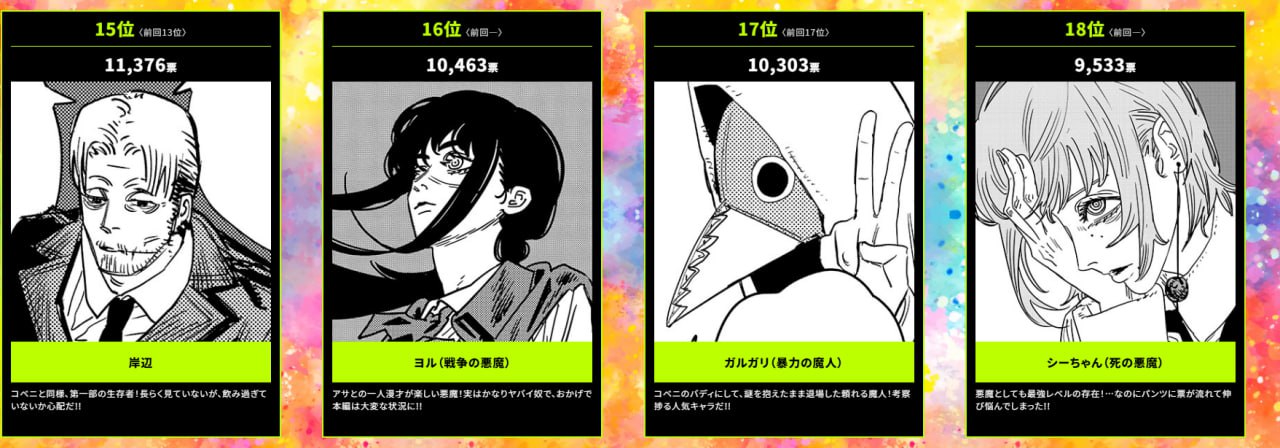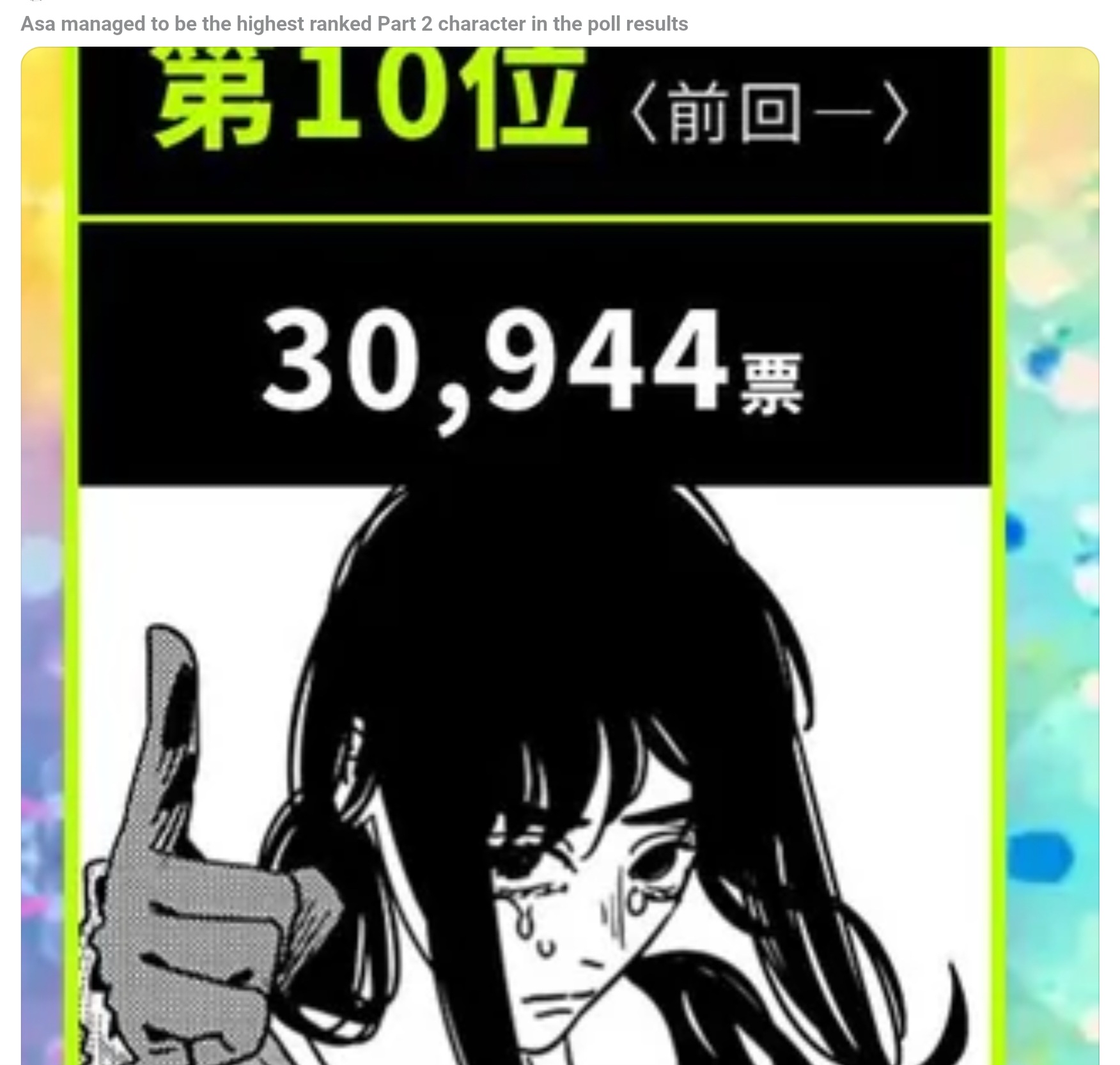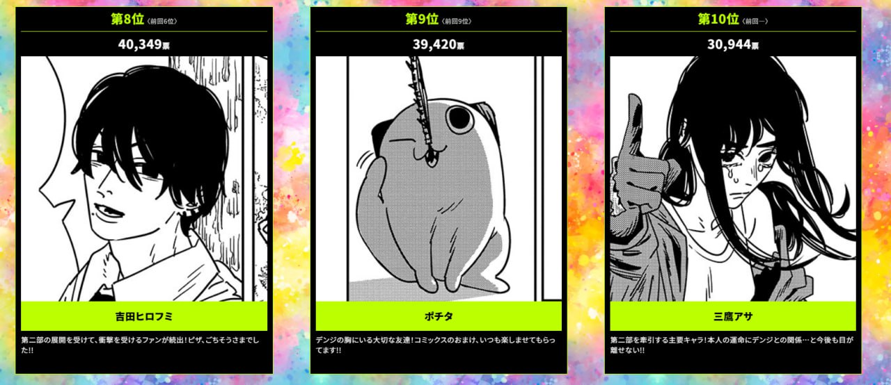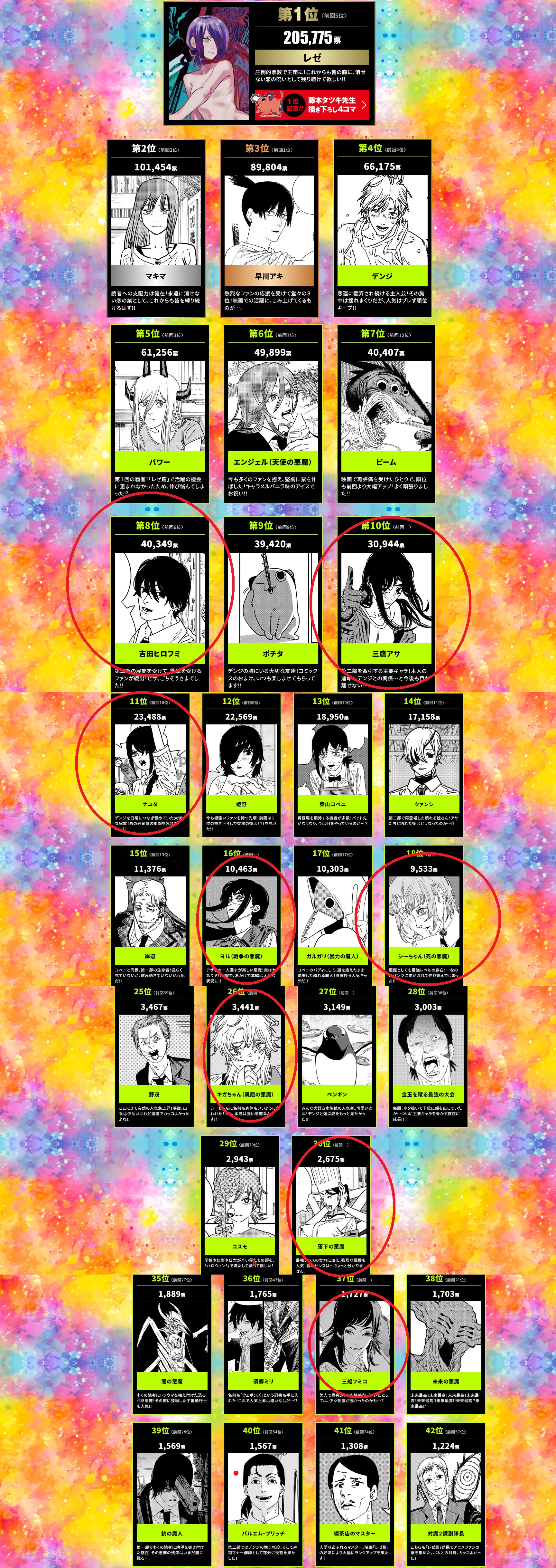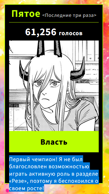 Стоп, то есть из каста второй части узбек занял второе место? Ору нах Как же Фудзимото обосрался с продолжением, если такой не раскрытый перс приманка обошёл всех Денджи можно даже не считать т.к он главный герой и выйдет легитимный топ 1 двушки в виде демона гомосятины