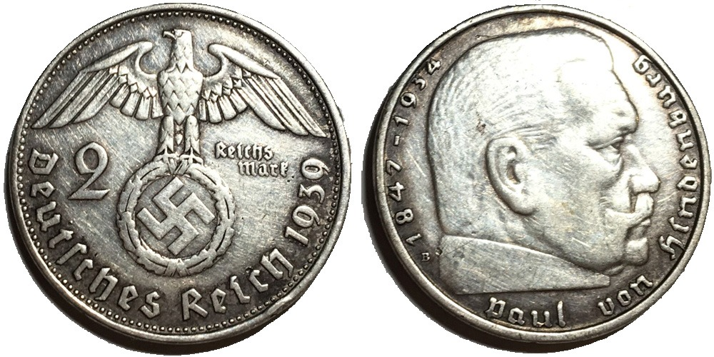 >>11760 Марки надо просматривать оценивать. Я этим не занимался. Монеты в основном все обычные. Просто старые. Была одна интересная: монета третьего рейха 2 марки (пикрил, у меня 38го года), я видел такая за 1к руб продавалась.