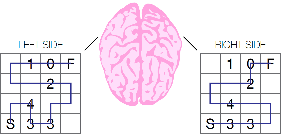 Цель - построить путь от клетки S до клетки F двумя различными способами. 1) Цифры обозначают, сколько угловых сегментов имеет путь в данной клетке или в смежных с ней клетках. 2) Цифры обозначают, сколько прямых сегментов имеет путь в данной клетке или в смежных с ней клетках.