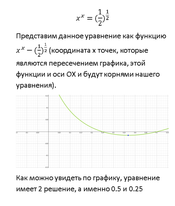 Дратути, в математике есть такой термин "выразимость в радикалах", если давать четкое определение, то: "Элемент a поля F называется выразимым в радикалах над подполем G поля, если существует алгебраическое выражение, в которое в качестве чисел входят только элементы поля G, значение которого равно a. В случае, если в поле F корень является многозначной функцией, считается достаточным равенство числа a хотя бы одному из возможных значений алгебраического выражения." (источник:https://ru.wikipedia.org/wiki/). Если простыми словами, то термин "выразимость в радикалах" означает возможность уравнения привести к виду x=t (где t - это какое либо выражение не содержащее x). Например уравнение 5 степени и выше не выразимы в радикалах ( по теореме Абеля или Абеля-Руффини). Я уже 2 года маюсь над одним вопрос, а именно: "имеет ли уравнение xx=0.50.5 общее алгебраическое решение (или же выражаясь более строго: выразимо ли это уравнение в радикалах)?" Я понимаю интуитивно, что оно его не имеет этого алгебраического решения, но в силу своих знаний не могу доказать это строго (используя группы Галуа и так далее). Его корнями являются числа 1/2 и 1/4, только как к ним придти алгебраически? нА картинке, которую я прикрепил есть графическое решение данного уравнения.