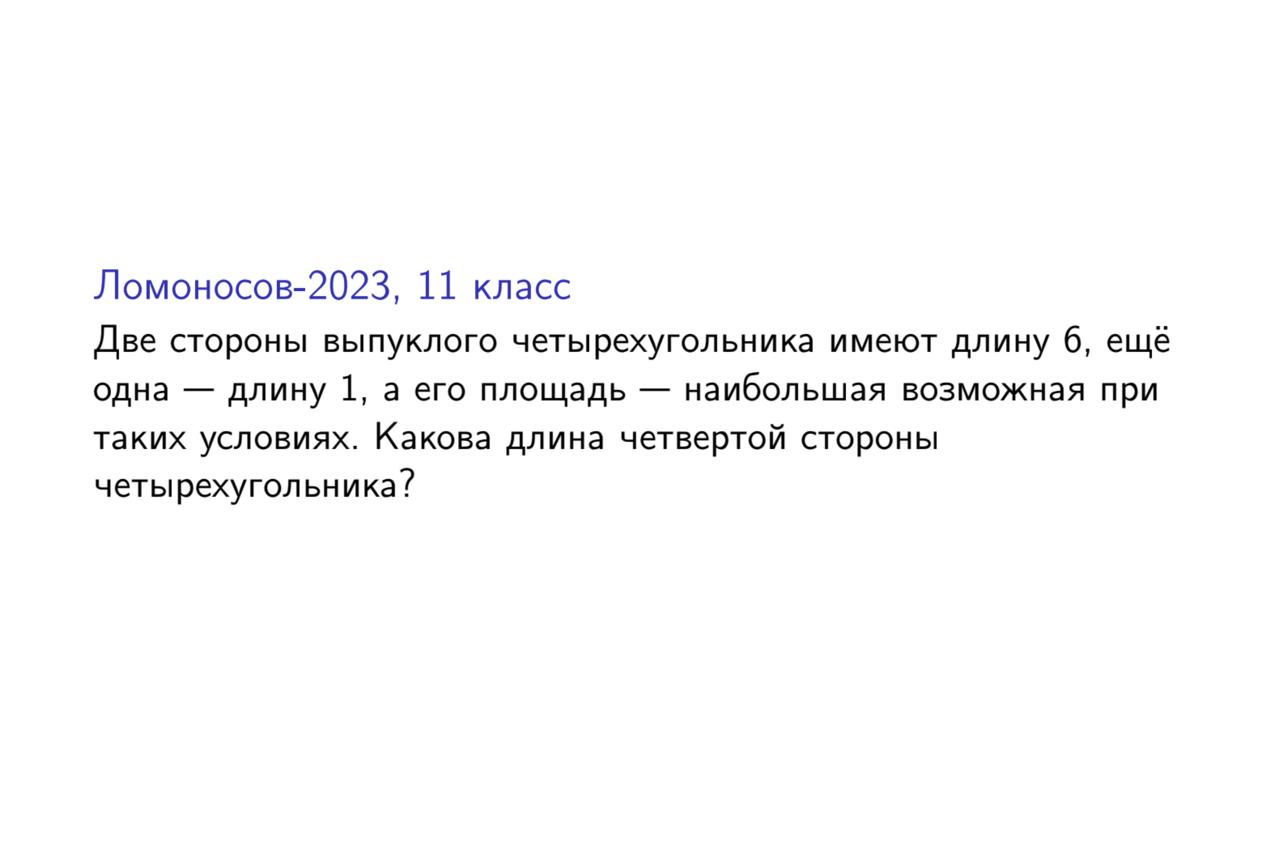На днях я начал решать вот эту задачу (пик рилейтед № 1), где фигурирует поиск максимума площади 4-угольника. Не ведая, каким путём это вообще максимизировать, я вопросил у эйая (ai, искусственного интеллекта, электронного ублюдка). Получив ответ, я сделал снимок (пик рилейтед № 2) и написал : “ поверим эйаю на слово, что максимальная площадь у такого, все вершины которого лежат на одной окружности? ”
