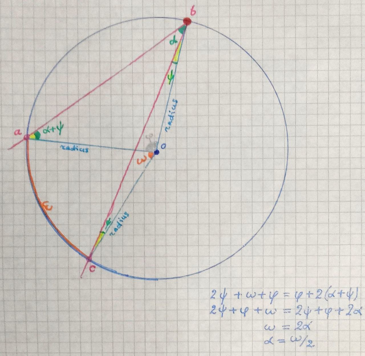 Остановился ли я? Нет!! Я продолжил поиски в Википедии, но оказалось что доказательство этого всем давно известного совершенно абсолютно очевидного фундаментальнейшего факта https://en.wikipedia.org/wiki/Inscribed_angle настолько муторное, что приводится аж отдельно для трёх случаев.