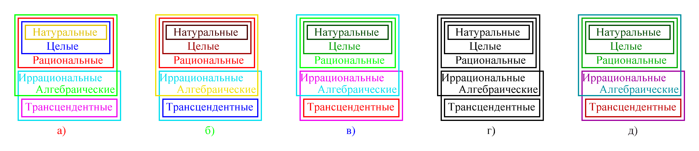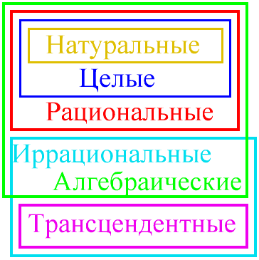 >>104974 Вариант В. Но ваша картинка не очень хороша, как минимум, потому что у вас изображено так как будто Алгебраические числа = рациональные + чуток иррациональных, а Алгебраические числа это подмножество Комплексных чисел, а не Вещественных