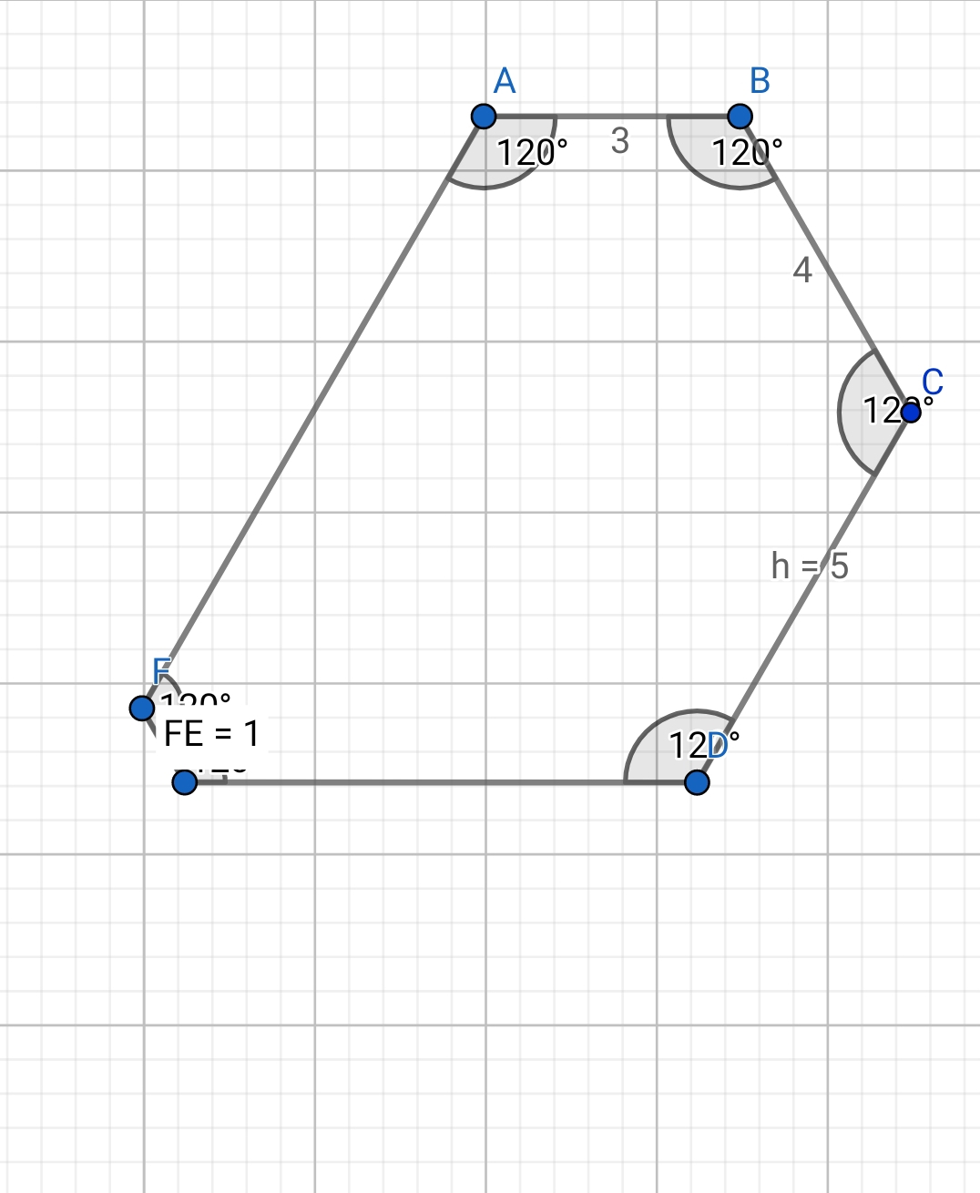 Ананасы, помогите решить задачу. Данно: AB = 3 BC = 4 CD =5 EF =1. Нужно найти сумму DE и AF сторон, если все внутренние углы равны.