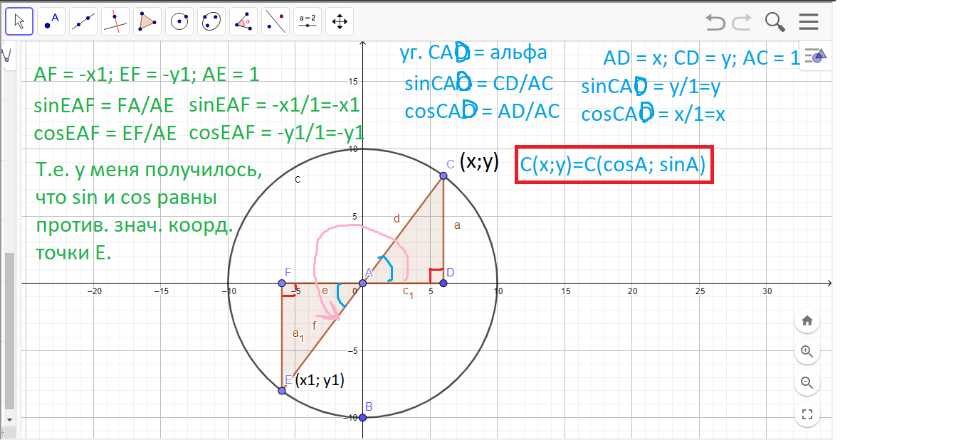 Всем доброго времени суток! Я не могу понять, почему координаты точки на единичной окружности равны синусу и косинусу. Точка A(x;y) = A(cosАльфа; sinАльфа). Я могу понять это, когда точка находится в первой четверти, но не в других. У меня все наоборот получается. На картинке попытался показать, что я имею ввиду. Объясните, пожалуйста! Я уже все на Ютубе посмотрел, все равно не понимаю.