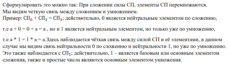 у нас есть СП с элементом ноль - какова сила данной СП? Ну, для начала надо рассмотреть сам ноль, а точнее его кол-во сомножителей, как нам велит Силовая Последовательность, сколько сомножителей у 0? бесконечно. Почему? Мы можем представить ноль в виде: 0 = 0 1 2 3 4 5 ..., т.е представить его произведение в виде бесконечного произведения, следовательно у 0 бесконечное кол-во сомножителей, отсюда следует, что СП с элементом 0 имеет силу бесконечность. Это по началу смутит читателя, но, если мы вспомним упомянутую связь элементов СП и их роли в умножении(роль у элементов СП(1) в умножении) и роли силы СП в сложении(Сила СП(1)- базовый элемент сложения), то можно интерпретировать роль нуля в умножении и бесконечности в сложении одним и тем же свойством; действительно, 0 1 = 0, 0 15 = 0, 0 * 3456765 = 0, т.е при умножении нуля на любое число мы получаем ноль; тоже и с бесконечностью по сложению: бесконечность + 5 = бесконечность, бесконечность + 128 = бесконечность т.д т.е при сложении бесконечности с любым числом мы получаем бесконечность и четко видим связь меж элементом СП(бесконечность) и силой СП(бесконечность);