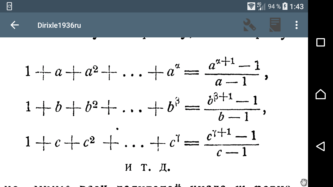 >>101005 Когда ищут подобные суммы то пробуют с ними что-то сделать, например продублировать. Так ты можешь найти сумму (1+2+3+...+n) например. Возьми копию R=(1+a+a2+a3+...+an). Что с ней можно сделать, чтобы упростить исходное выражение? Можно домножить на (a) и вычесть оригинальный ряд. Останется только a(n+1)-1. R(a)-R=a(n+1)-1 R(a-1)=a(n+1)-1 R=[a(n+1)-1]/[a-1]