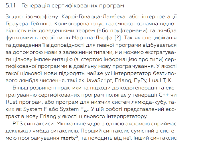 Не совсем в тему, но пусть будет. Книга Сохацкого "ПЕРША ФОРМАЛЬНА СИСТЕМА Формальне середовище виконання, система вищих мов та базові бібліотеки для програмування, доведення теорем і формальної філософії", применительно к теме треда интересна простым и понятным изложением конструктивных систем типа MLTT. https://formal.uno/ https://formal.uno/monography.pdf