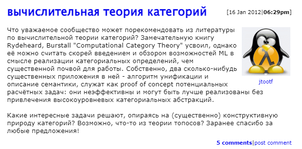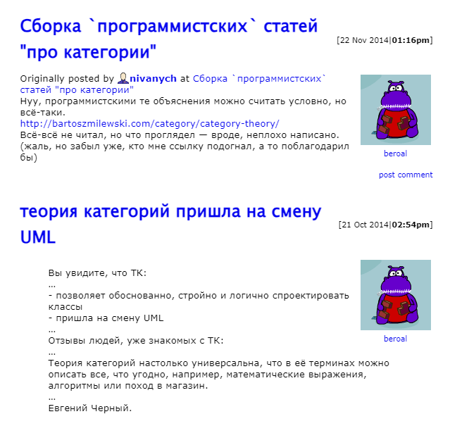Впрочем, это я как-то уже далеко ушёл от программистской тематики именно в сторону логики. Непосредственно программистам, конечно, никакие категории не нужны. Это исключительно понт всяких закомплексованных хаскеллистов, которые почему-то думают, что чем больше умных слов типа "Расширения Кана" они выучат, тем большим уважением будут пользоваться в своём коммьюнити. При этом извне на них обычно смотрят в лучшем случае с недоумением, а в худшем - как на клоунов. И не потому, что ничего не понимают, а ровно наоборот- потому что понимают всё слишком хорошо.