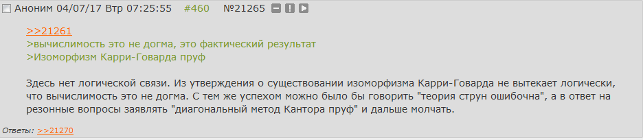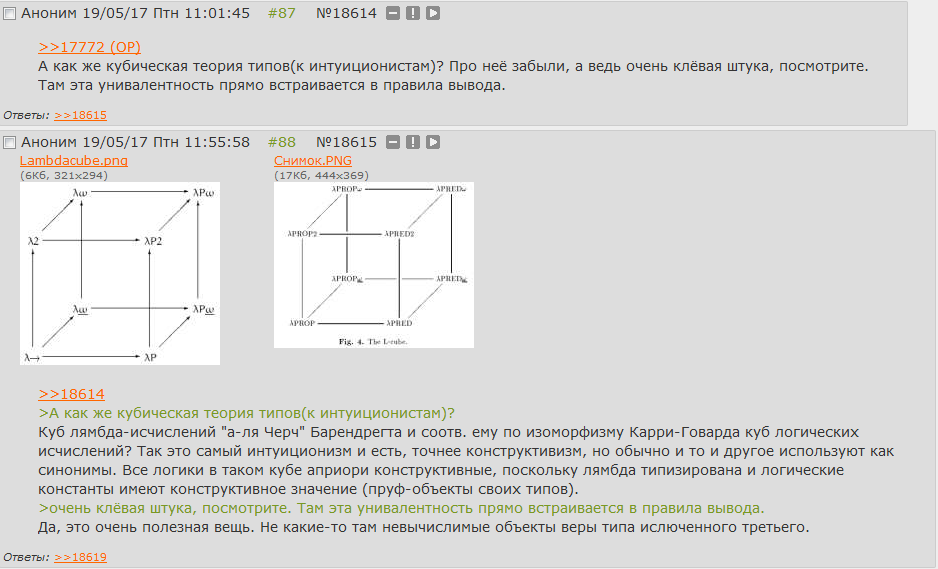 Самое смешное, что местные долбаебши даже не понимают, что и Сохацкий,и Воеводский, и Мартин-Леф, и Мортберг - это все советская школа конструктивизма. До Мартин-Лефа, учившегося в МГУ у Колмогорова, никто не рассматривал логику Гейтинга или лямбды Черча как основу для программного обеспечения. Даже универсальная машина Тьюринга это был просто удобный формализм, чтобы веру Гильберта в рай Кантора и исключенное третье обоссать, разве что AUTOMATH де Брауна был чем-то относительно практическим из того что не относилось к советской конструктивной школе. По-сути, спектральная категория формальных языков Сохацкого - это на данный момент вершина развития советского конструктивизма. Но вы ж дебилы, у которых мозгов хватает только чтобы кукарекать что-то про хохлов, потому что их в телевизоре показывают.