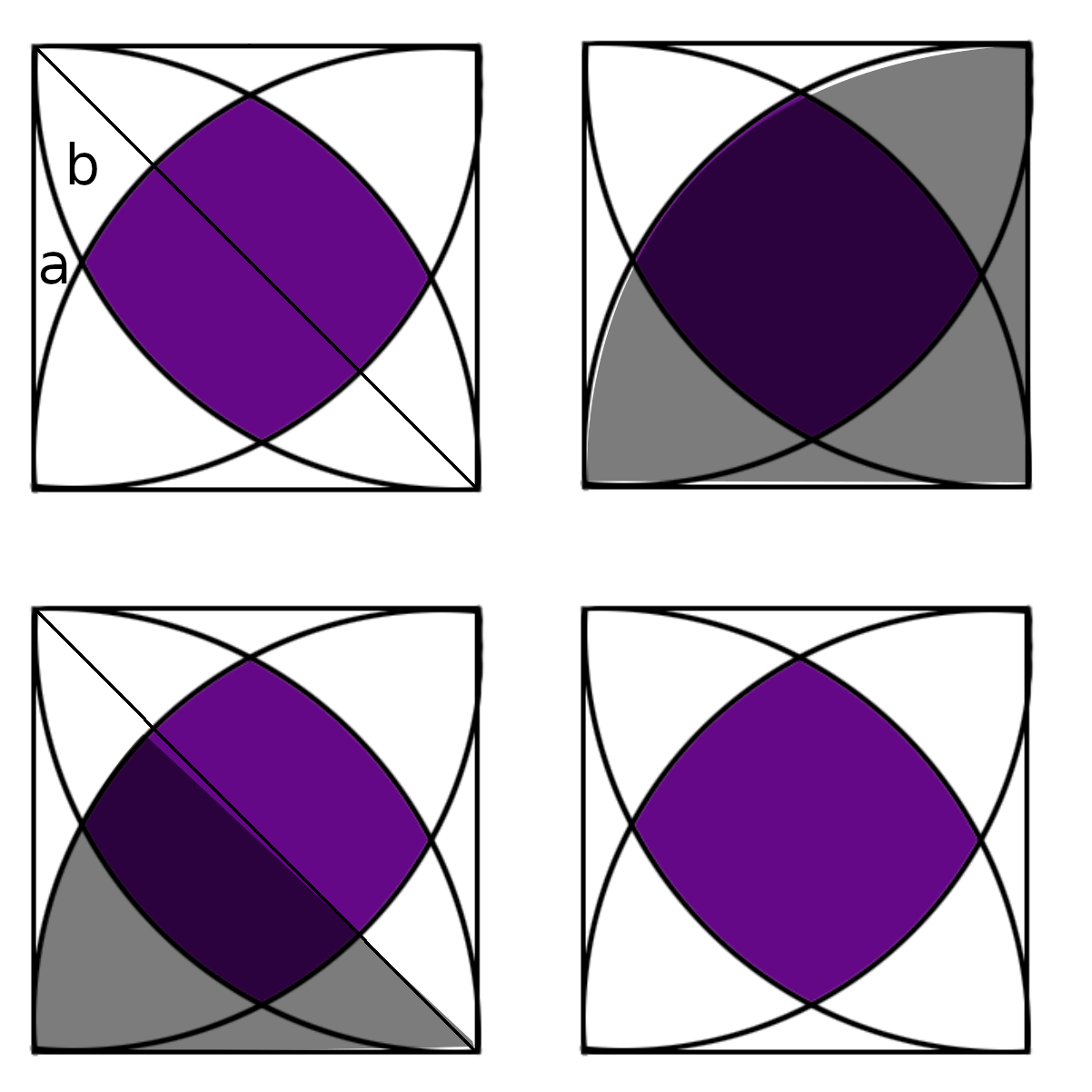 >>116919 (OP) > Нужно найти площадь фиол фигуры.Задачка в общем виде. Смотри, есть площади a и b. Разность площадей квадрата и четверти круга составляет 2a + 2b. Разность площадей треугольника и одной восьмой круга составляет 2a + b. Зная площадь квадрата и круга, ты можешь отыскать a и b. Затем тебе нужно вычесть из площади квадрата 8a + 8b. Получится площадь фиолетовой фигуры.