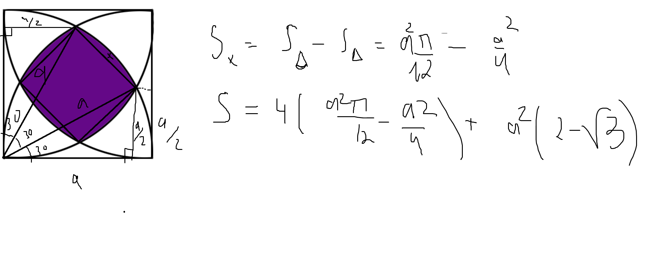 Тупая вершина сектора A лежит на дугах, то есть до неё так же расстояние R. У нас есть равносторонний треугольник R. Отхуярим половину чертежа. Что имеем? Половина состоит из: половины равнобедренного треугольника площадью R²/2 Сектора круга 30°, то есть Q/3 и половинки от a