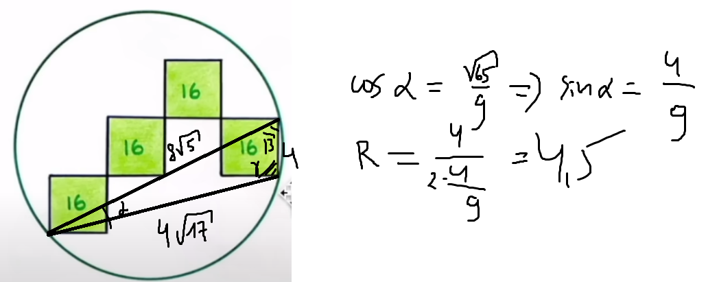 >>117475 радиус круга, описанного вокруг треугольника, выражается через стороны треугольника и его площадь (в википедии есть формула); и то, и другое вычисляется по картинке без всяких синусов и дробей вообще устно. перепроверь вычисления