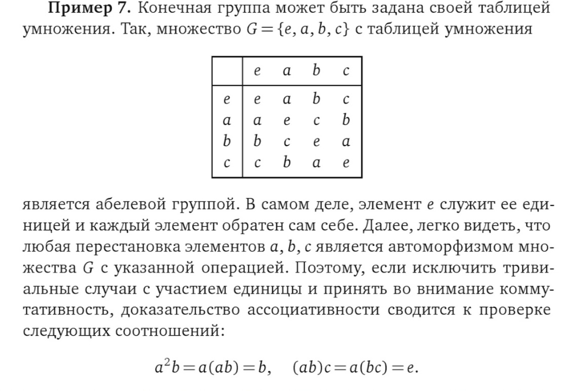В процессе чтения Винберга возник вопрос. G={e,a,b,c} — абелева группа с таблицей умножения пикрил. Не могу понять, почему перестановка элементов a, b, c является автоморфизмом G с указанной операцией (той, которая таблице задаётся, да?). Почему в перестановке участвуют только a, b, c, что делать с e? Как строить-то этот автоморфизм?