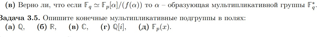 Ребят, вот вы в алгебре уже ебать прошаренные, а я только на пути возмужания. То, что сверху, как делать? Туплю, кажись уже передознулся этой алгеброй вашей. Понимаю, что f(a) в Fq имеет единственный ноль на a и что на остальных многочленах этой степени и ниже с коэффами из Fp на альфа не ноль, но что дальше делать -- не представляю. Понимаю, что a порождает базис в факторкольце многочленов над Fp, в принципе если постараюсь, докажу, что элементы из Fp порождаются (хотя хз), но как линейные комбинации получить -- не представляю.