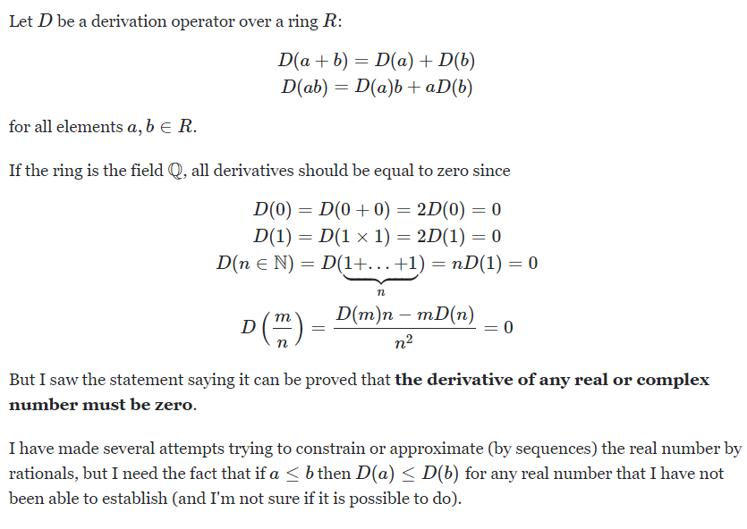 >>52289 Операцию предельного перехода, понятие непрерывности и всё такое, невозможно описать алгеброй. Для этого придумали топологию. 99% математики это переплетение алгебры и топологии. Например, функциональный анализ. Берем алгебраический объект (векторное пространство), добавляем топологическую структуру (пополняем по норме). Или гомологическая алгебра. И т.д. >ассоциативных Ну тех где выполняется аксиома ассоциативности, очевидно, a (b c) = (a b) c. >правильных и неправильных дробей Про рациональное число лучше всего думать как про класс эквивалентности, 5/15 и 1/3 это не разные числа, просто разный способ записи одного и того же числа. То же можно сказать про 0.99999… и 1.