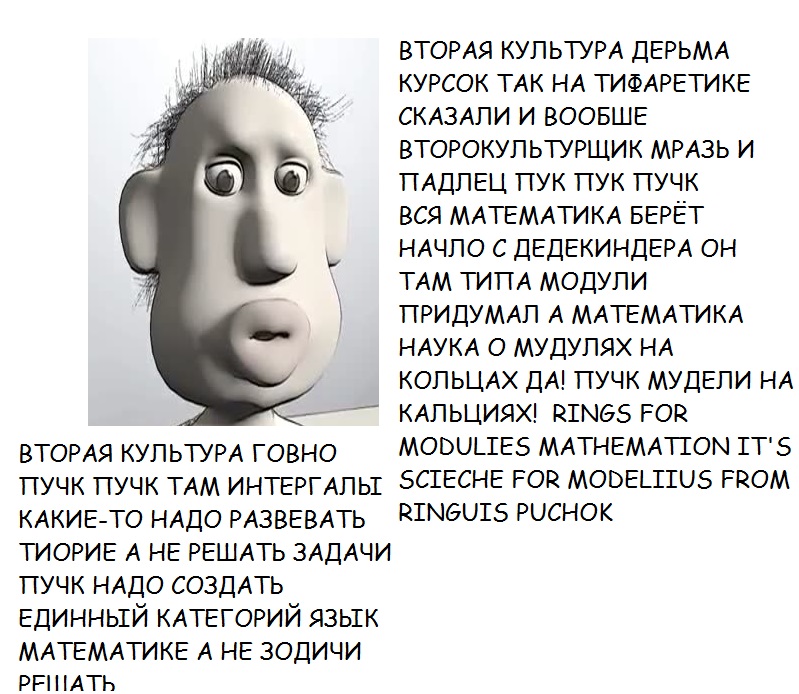 >>52329 Группа это нечто, да. А ещё группа это точка. А дифференциал это стрелочка. Если ты хочешь чтобы твои >глубокомысленные выверты сравнивали с определениями, которые были у Нётер и Гильберта, потрудись, во всяком случае, выражаться внятно. >>52371 >более одного анона, которые считают, что ты Тащемта только ты и ещё один ворвавшийся в тред поборник категорий по Арнольду, который, видимо, скоро расскажет нам, что такое группоид. Впрочем >когнитивный диссонанс >гонять нубов >свои родные разделы, жж, лурк Ты жертва Пикабу что ли? Так бы и сказал. В принципе это интересно, конечно, больше ебанатов с разных ресурсов, живее раздел, вот уже обсуждения какие-то. Правда довольно однообразные в твоём случае.