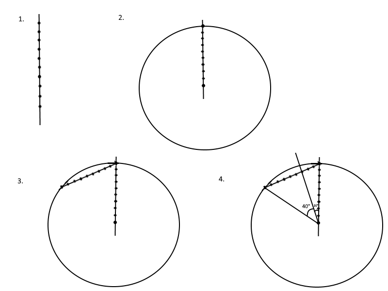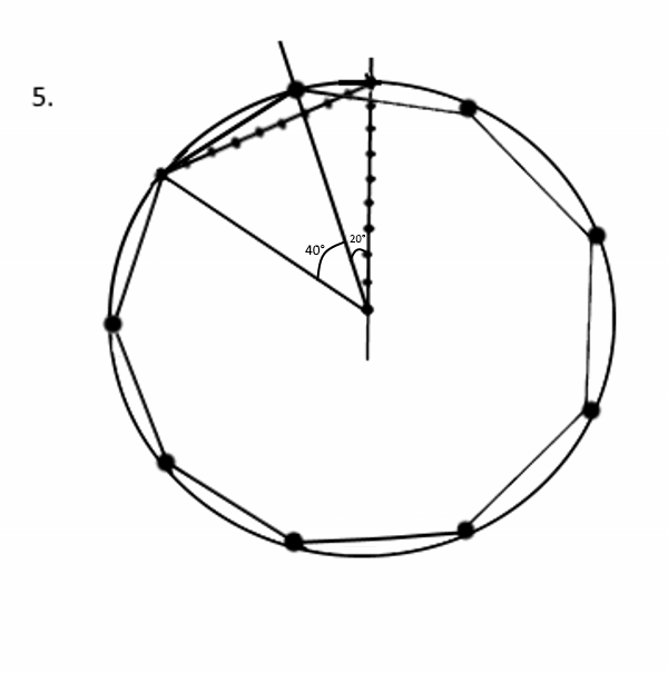 >>21624 >4. Через общую точку шестого и седьмого отрезка на хорде проводим из центра окружности прямую. ... Получится, что угол в 60 градусов при центре окружности разделяется прямой на углы в 20 и 40 градусов соответственно.