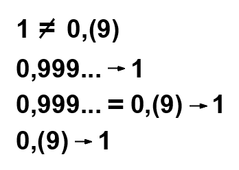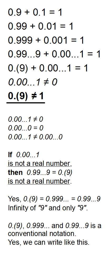 0,9 + 0,1 = 1 0,99 + 0,01 = 1 0,999 + 0,001 = 1 0,99...9 + 0,00...1 = 1 0,(9) + 0,00...1 = 1 0,00...1 - не число, дескать, ага отлично, а 0,99...9 = 0,(9) тогда почему число? И в Википдении такие же сидят, ничего не понимают, это "не число" - всё объясняет у них и на фринодах тож.