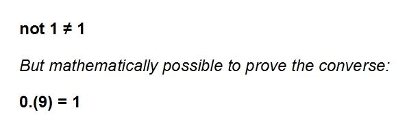 1 = 0,(9) Точка 1 равно бесконечное стремление к 1, но никогда не 1. Как тут может стоять знак равенства?