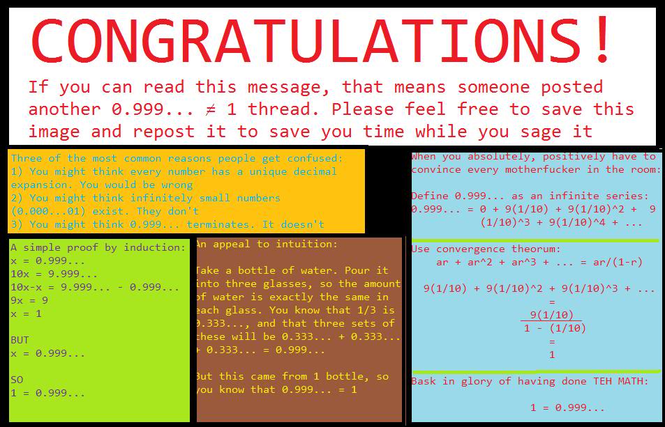 >>34399 Но лучше как там {{9х10-n} | n ∈ N\{0}} это будут слагаемые, их сумма равна 0.(9) 0.(9)=x, 10x=100.(9)=9+та же сумма, мы просто при умножении сдвинули индексы на 1, пользуясь тем, что множество слагаемых счётно*. Ну и 10x-x=9x=9+сумма-сумма=9, 9x=9, x=1, x=0.(9), 0.(9)=1. Короче то, что в курсиве тут и зарешало. Короче отрицая 0.(9)=1 отрицаешь бесконечность.