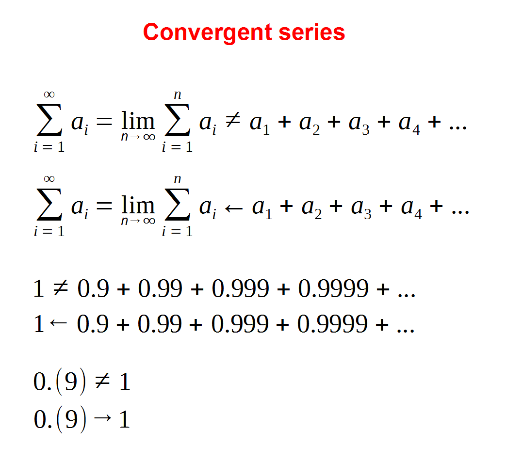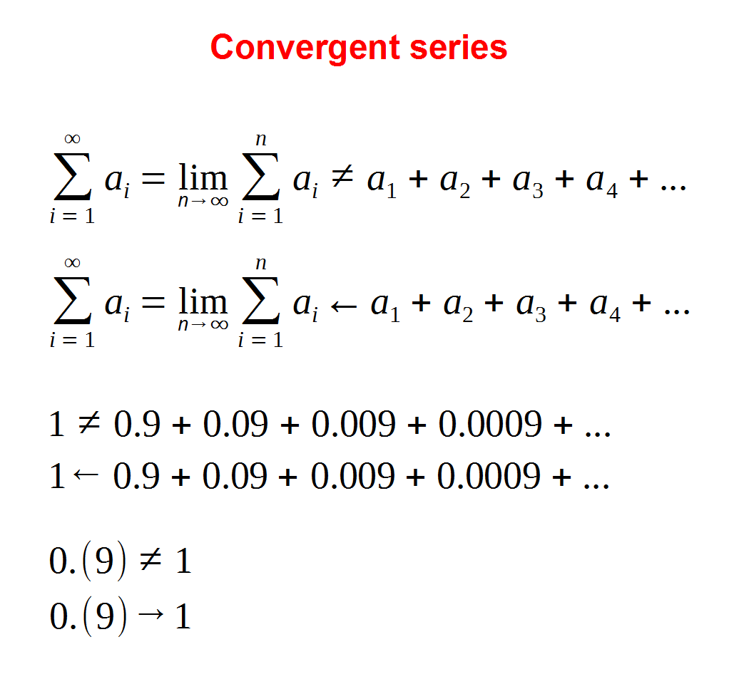 Пример выше, дающий 0,(9) = 1, там 0,(9) всегда было равно 1, а процесса стермления к 1 никогда не шло, это первая модель.