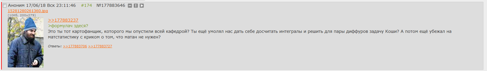 >>62438 Практика очень нужна, чтобы правильно понять определения, усвоить (а не просто прочитать на раз и "понять") техники доказательства и научиться их применять в аналогичных ситуациях. Но это касается скорее задач на доказательство, а не взятия типовых интегралов и диффуров. От решения типовых интегралов ты научишься, грубо говоря, не впадать в полный ступор, когда у тебя в какой-то задаче вдруг появится интеграл. Ещё, возможно, научишься, увидев задачу на языке "заказчика" - про Машу, Петю и ящики с яблоками - перевести её на язык диффуров, получить внятный ответ и не впасть при этом в полный ступор. Зачем эти навыки программисту - не знаю. Может быть, из вас готовят каких-нибудь вычислителей, моделлеров и оптимизаторов, которым эти навыки действительно пригодятся реквестирую пикчу, где чувак с пафосом решает квадратное уравнение методом перебора. Правда, тогда не совсем понятно, почему у вас мало часов алгебры, потому что со всякими матрицами в численных методах тоже приходится изрядно потрахаться.
