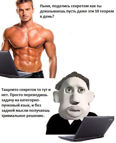 >>59223 >С категорий обпучкался в голос. Но "изучение теории категорий как таковой" ведь реально мастурбация , только местные амбивалентные шизики, у которых тм и основания не математика, а теоркат внезапно математика, возводят теорию категорий в абсолют.