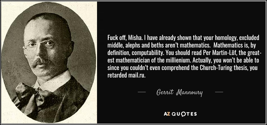 В ОБЩЕМ НЕ ЗНАЮ О ЧЁМ ТУТ РАЗГОВОР МОЖЕТ БЫТЬ, ЯСНО ЧТО ГАММА-ЛОГИИ В КАТИГОРИИ ПУТЧЕЙ МНОЖЕСТВ НАКРЫТИЙ В ТОПАЗАХ И АЛМАЗАХ ГРОТЕНДИКА, ЦЕНТРОСТРЕМИТЕЛЬНЫЕ АЛГЕБРЫ, КОРЕННЫЕ РАЗЛОЖЕНИЯ РЕДУКТОРНЫХ ГРУПП БРЮСА ЛИ, ВСЁ ЭТО НЕ ЗНАЮ ВОБЩЕ ЧТО! А НЕ МАТЕМАТИКА! Я ПРИНИМАЮ ТОЛЬКО ТЕЗИС ЦЕРКВИ (CHURCH) И ДОКТРИНУ ИНТУИЦИОНИСТОВ ПОСЛЕДНИХ ДНЕЙ! IN THE LAST TESTAMENT IT WAS CLEARLY STATED THAT ONLY THOSE WHO ARE BLESSED WITH COMPUTATION AND WHOSE ALGORITHMS ARE SOLVABLE, WILL BE ALLOWED INTO THE HOUSE OF THE FATHER (L.E.J. BROUWER).