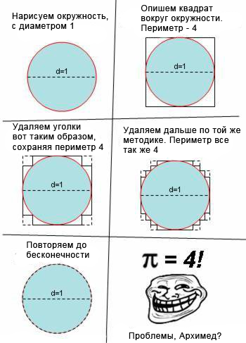 >>50547 Это тут не причём. >>50537 Вырви один уголок. Сумма его катетов очевидно больше дуги, заключенной в нём, как угодно малый ты уголок не бери. То есть сумма длин ступенек всегда впереди от суммы длин дуг, заключенных в них. А вот если брать гипотенузы уголков, то чем меньше уголок, тем гипотенуза более равна по длину заключенной дуге. Потому складывая гипотенузы уголков ты получишь длину окружности, а автор складывает катеты.
