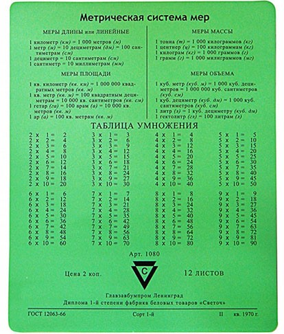 Говно: непонятный набор мутной хуйни, который печатали на задней стороне тетрадок в клетку в моем детстве. Это не таблица, это восемь колонок ненужной поебени.