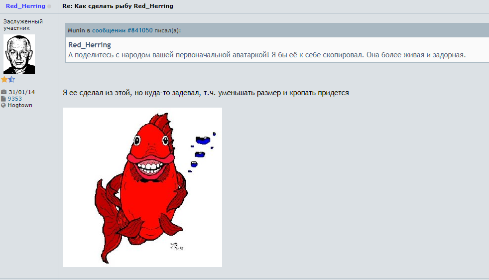 https://dxdy.ru/topic82464.html >Вечер потратил на то, чтобы легко и просто, циркулем и линейкой построить контур рыбы-аватары математика Red_Herring. Из чертежа все должно быть ясно (начинаем с красных равносторонних треугольников): >Наконец-то посмотрела перевод этого словосочетания. Кроме "рыбного" - копченая селедка, есть еще "отвлекающий маневр" и "красногвардеец". Кто же наш участник? >Перевод однозначный - "красная сельдь". Сами посудите: кого еще собирается отвлекать автор этого ника? Копченая же селедка - это мелко. Насчет красногвардейца... Лучше промолчу. Нахлебались мы с такими в свое время.