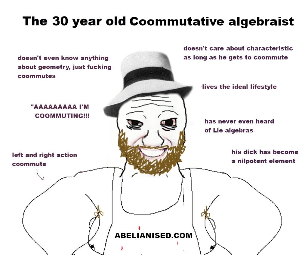 >>59223 Здравствуйте! Я пучкист Пыня. Это моя профессия. Так сложилось исторически. Когда-то я напучкал в алгебраическую геометрию. Теперь там изучают пучки, схемы, абелевы многообразия и еще много полезного. Теперь там категории, с функторами и топосами. Теперь там не изучают коники и кубики, как это было до пучкистов.