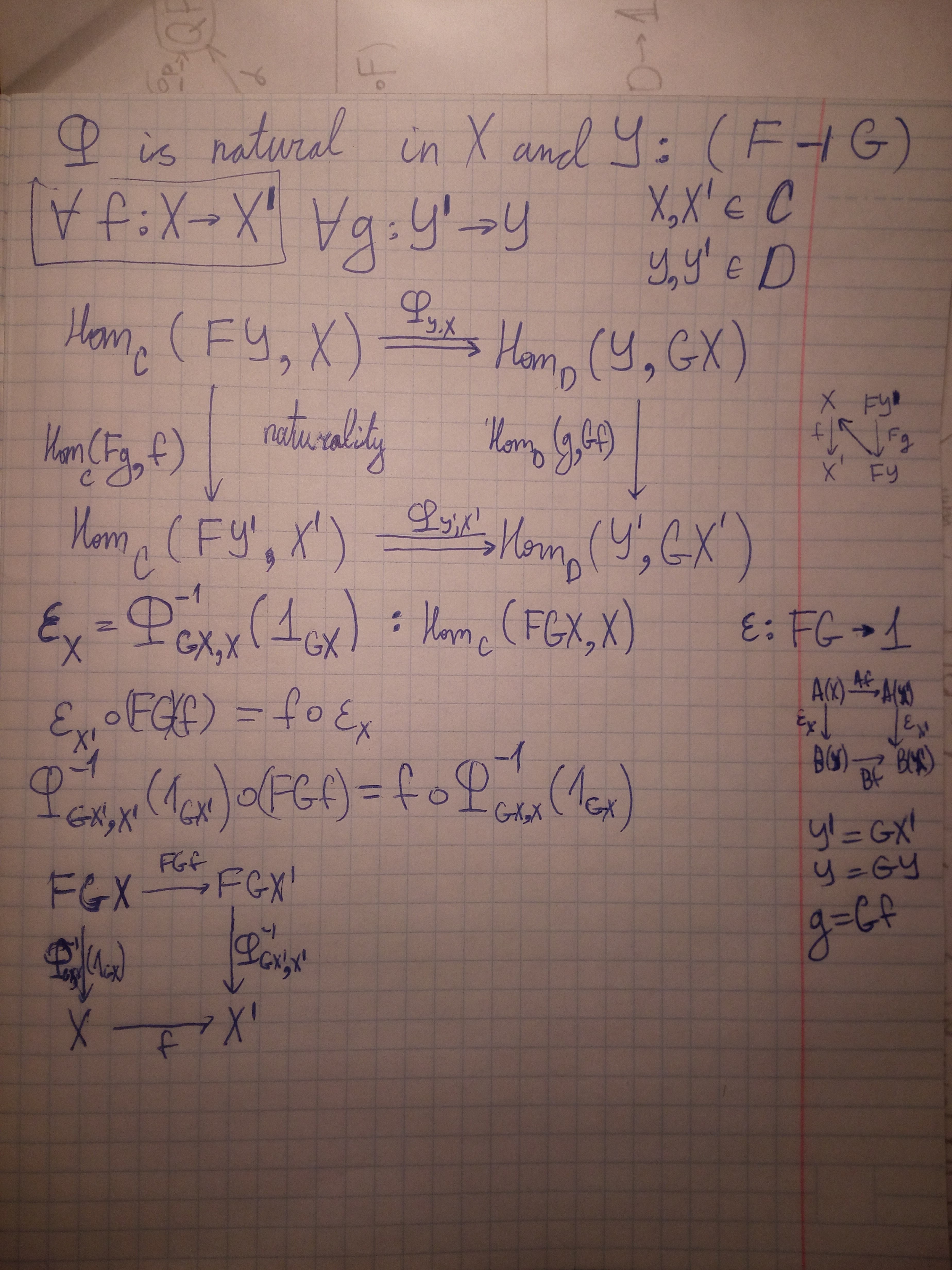 >>2473 (OP) Коединица, определённая через биекцию hom-множеств - не просто функция, переводящая одни объекты в другие, а аж натуральная трансформация функторов! Всё записал на пикрелейтед(в обозначениях крупной статьи на вики, разумеется), но не вижу как доказать нижнюю коммутативную диаграмму, которая всё и докажет. Откуда она следует?