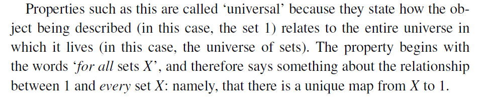 >>42072 Немного проблематично дать универсальное определение универсальности (pun intended). В простых терминах, это такое свойство объекта, которое делает все другие объекты, им обладающие, изоморфными данному. Но это определение на самом деле выглядит так себе. И Аводей приводит ненамного более внятное определение как "no junk, no noise". Оно хуёвое. Именно поэтому в данном случае определение через примеры лучше. Он писал, как умел. Не стреляйте в Аводея. Ну и опять повторюсь, я не его фанат. Лично мне Лейнстер нравится больше.