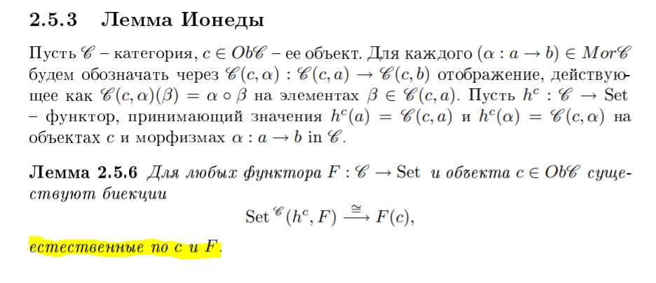 >>84035 именно то У тебя там изоморфизм между двумя хренями, которые зависят от c и F. Эти хрени надо вообразить себе как функторы (как они действуют на морфизмы между объектами типа c и F) и рисовать диаграммы, как я указал. Естественность означает коммутативность этих диаграмм