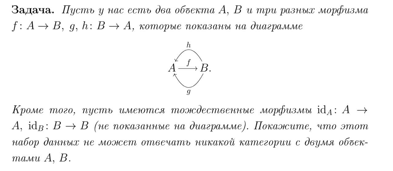 >>85010 имеем $h \circ f = g \circ f = \operatorname{id}_A$ и $f \circ h = f \circ g = \operatorname{id}_B$ эти соотношения означают, что оба морфизма $g,h$ суть двусторонние обратные к $f$, следовательно, они равны; это противоречит условию (что они разные)