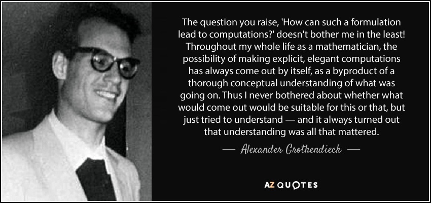 >>40938 Гротендик считал, что тупо перебор - некрасивое решение. Задача не решена по-настоящему, пока не придумана общая красивая теория, позволяющая решать целый класс аналогичных задач.