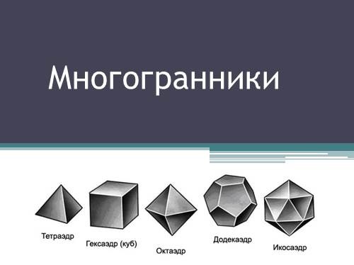 Теперь ЧИТАЙ интересное: Пять тел Платона. Во всем мире, в трехмерном пространстве, существует лишь пять правильных форм, форм, где все стороны равные. 1.Тетрадэдр— многогранник, у которого четыре грани — треугольники. 2.Октаэдр — многранник имеющий восемь граней 3. Гексоэдр, или куб — многогранник, каждая грань которого — квадрат. 4. Икосаэдр — двадцатигранник, фигура имеющая двадцать граней. 5.Додекаэдр — фигура, составлена из двенадцати правильных пятиугольников.