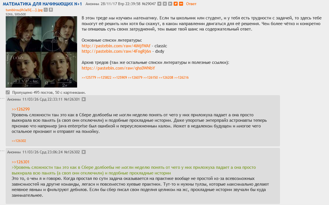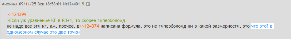 >>125963 может статься, он вообще не учился или недоучился; стал кодером, но испытывает фрустрацию от того, что что-то упустил, попытался самостоятельно поизучать физику и математику; такие персонажи встречаются