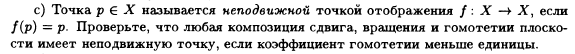 Понятно, что для любой композиции сдвига и ротации будет одна неподвижная точка, но если от этого еще и гомотетию меньше 1 взять (или вообще любую кроме 1), то каким нахуй образом эта точка останется неподвижной, если только специально её центром гомотетии не взять (но это противоречит условию ЛЮБАЯ композиция).