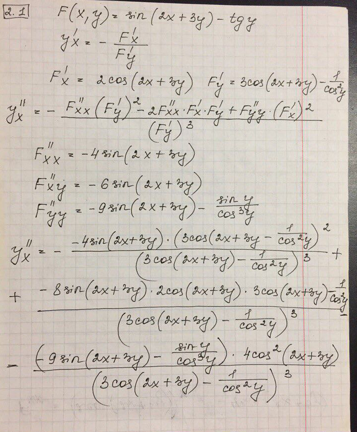 >>32479 Неправильна формула второй производной в [2.1] y''xx в числителе должно быть Fxx(Fy)^2-2FxyFxFy+Fyy(Fx)^2. В задании [2.1] в формуле y''x Fyy неправильно подсчитана, вторая производна от tg''(y) = 2sin(y)/cos^3(y) по y. [2.2] вроде правильно