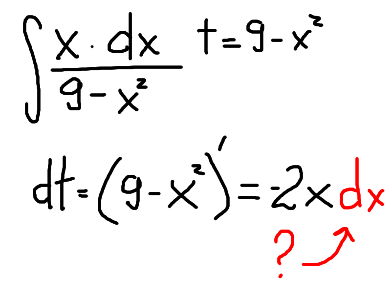 Вот простой пример замены переменной, который я нашел на одном из сайтов, и меня интересует, почему d(t) равен не просто -2x, а -2x*d(x). Откуда взялся дифференциал x?