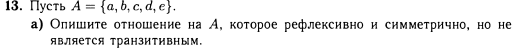 Пацаны, объясните. Вот определение: ТРАНЗИТИВНОСТЬ := (x, y) ∈ R ⋀ (y, z) ∈ R → (x, z) ∈ R Пусть A = { a, b, c } и есть такое отношение на А: R = { (a, a), (b, b), (c, c), (a, b), (b, a) } Нигде в определении транзитивности не сказано, что x ≠ z. Тогда отношение R рефлексивно, симметрично И в любом случае транзитивно. Т.е. в случае, если отношение рефлексивно и симметрично, то оно не может быть НЕ транзитивным. Чому тогда пикрелейтед?
