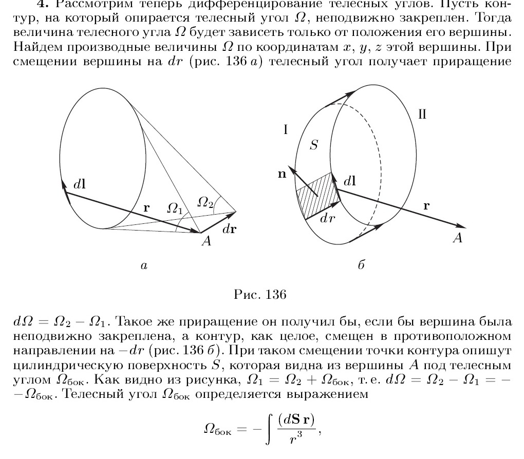 Утверждение: разность двух телесных углов одинакова, если: 1) Сместить на какой-то вектор вершину угла 2) Сместить на этот же вектор сам контур (в этом случае разница будет равна телесному углу, под которым видна цилиндрическая поверхность, описанная точками контура при смещении). Это идейно очевидно в каком-то смысле, но ни геометрически, ни математически не очевидно лично для меня.