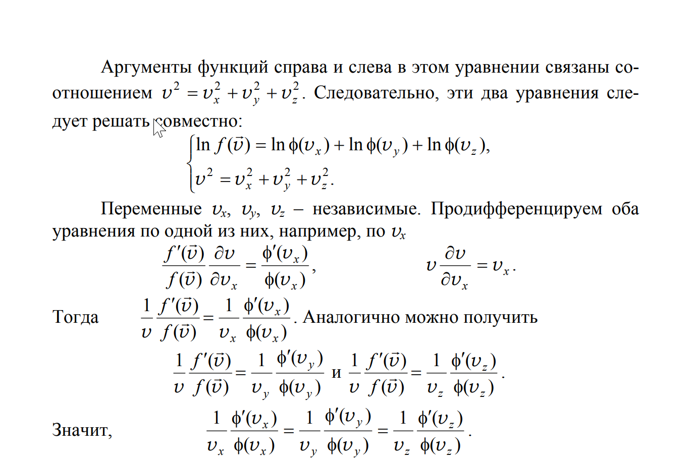 Анон, привет. Пытаюсь понять, как выводится формула распределения Максвелла. За основу взял вот это пособие: https://portal.tpu.ru/departments/kafedra/tief/method_work/method_work2/lab1/LabsMechMolecFiles/ModT-04.pdf И не могу понять начало страницы 5 (оно же и на пике). По сути в этой системе есть два понятия: вектор и норма. И берутся частные производные по одной из переменных (допустим, x). Для того, чтобы потом прийти к равенству, нужно, чтобы дифференциалы у обоих уравнений были одинаковые. Как я понимаю, это дифференциал нормы/дифференциал х. Почему такой дифференциал существует во втором уравнении - это понятно. Но как нужно продифференцировать первое уравнение, чтобы получить его там? И существует ли он вообще? Заранее огромная благодарность.