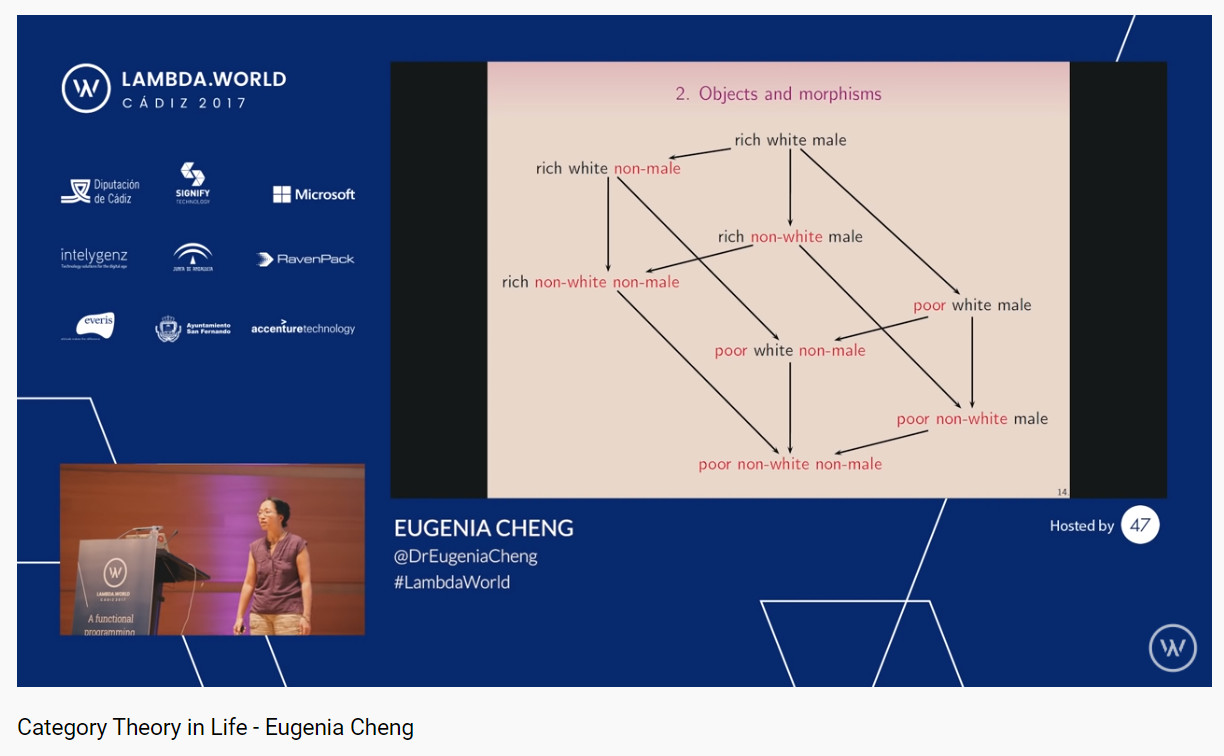 >>75759 1) Нет, тамошнЯЯ категорИЯ - не категория. 2) Используются самые-самые базовые понятия. Это как говорить, что ты используешь теорию множеств в решении своей задачи, если тебе нужно найти пересечение или булеан. 3) Теоркат возник естественным образом для обобщения совершенно конкретных идей из алгема и алгтопа, которые 3.1) не имеют аналогов в CS; 3.2) не могут быть поняты типичным программистом просто из-за колоссального порога вхождения (если они потратят пару лет на чистую математику, то может и поймут, но никто так не делает).